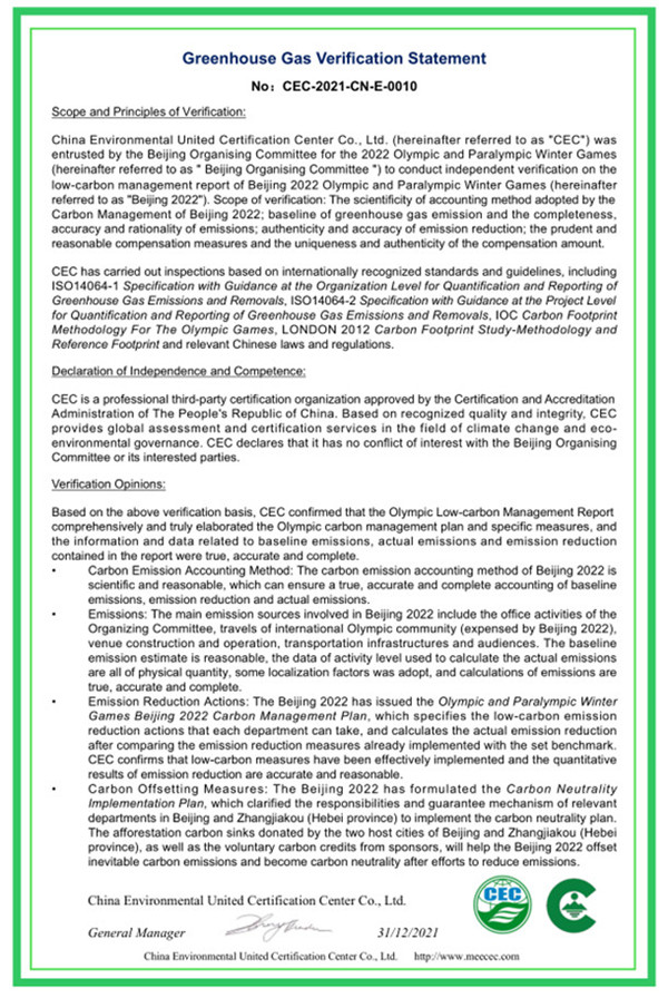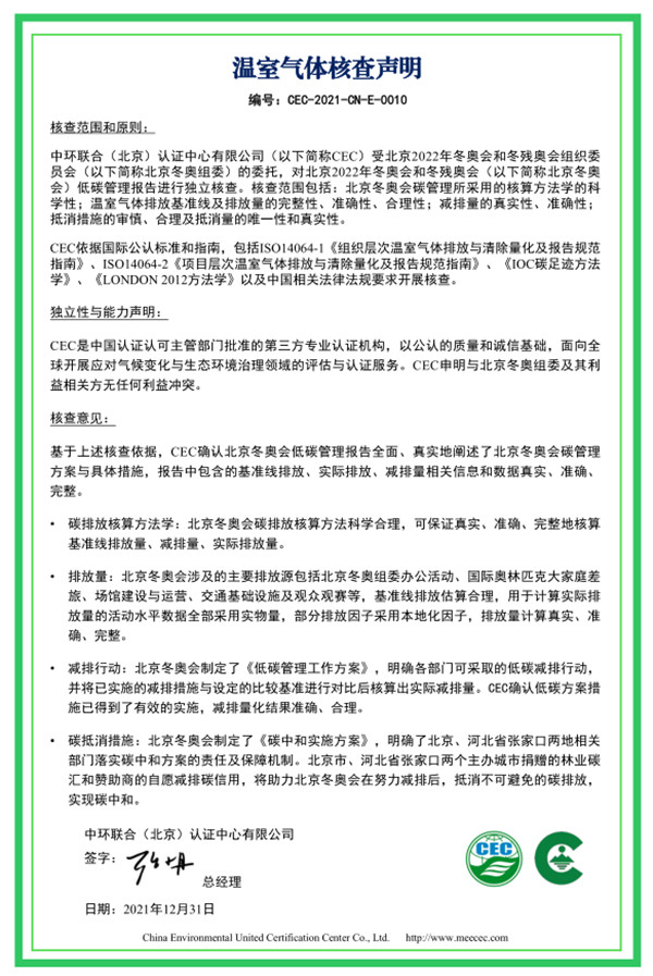 全球瞩目的北京冬奥会是中国提出“双碳”愿景之后实现碳中和的首个大型国际体育赛事。1月28日,北京冬奥组委在京发布了《北京冬奥会低碳管理报告(赛前)》(以下简称《报告》)中英文版?!侗ǜ妗废低痴故颈本┒禄崽脊芾硐喙毓ぷ髑榭?,重点介绍北京冬奥会碳中和方法学、温室气体排放基准线、实际筹备阶段过程排放量、低碳管理工作措施成效、林业碳汇工程建设、企业赞助核证碳减排量等。经过综合测算,北京2022年冬奥会和冬残奥会产生的碳排放量将全部实现中和。本报告中,中环联合认证中心出具了《温室气体核查声明》,负责对2022年冬奥会低碳管理方法学、核算、减排及抵消进行独立核查。